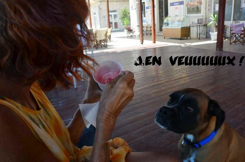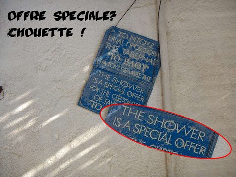 Là encore, bisous et rigolade. Puis ouzo, très léger, car, comme l'orage menace, je préfère décliner l'invitation à partager le repas et je décide de prendre la route: