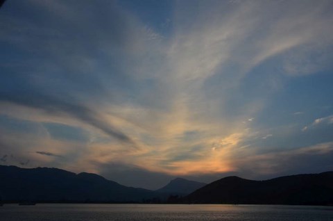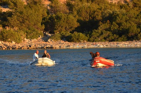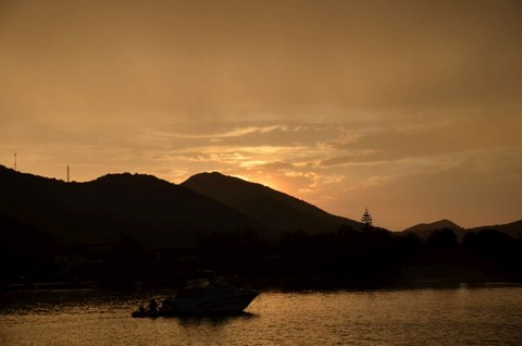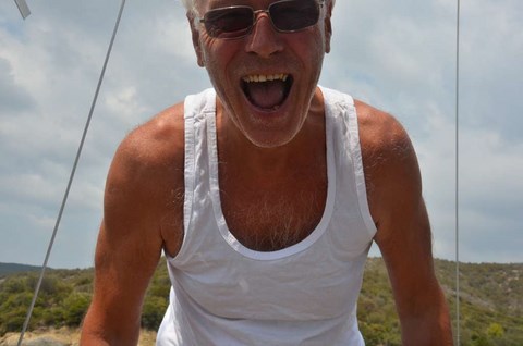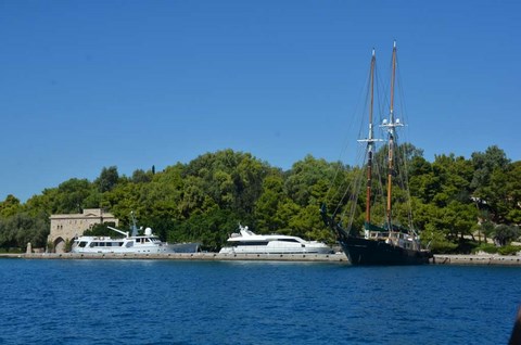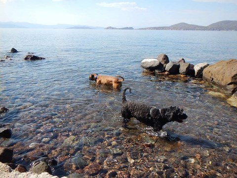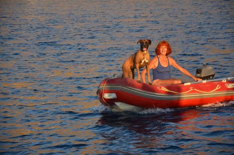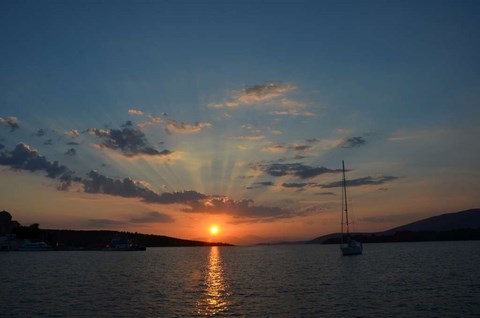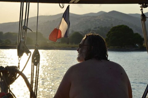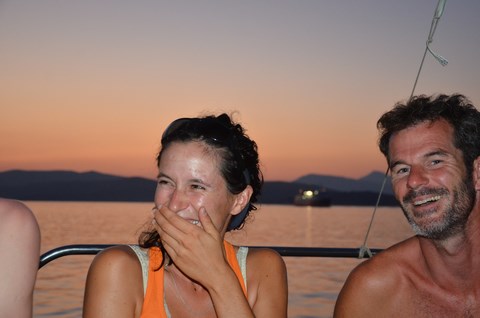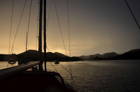 Du coup, on mouille dans la deuxième baie à Bâbord dans l'entrée de Porto-Helli. petit Paradis où nous serons seuls pour la nuit. Hélas, de 16 heures à 20heures, ce sont plus de..je sais pas moi, 300, 500 bateaux de toutes natures, qui passeront juste derrière nous, rendant ce mouillage, apparement calme, assez inconfortable jusqu'au coucher du soleil. Mais c'était bien quand même: