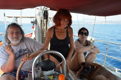 Après ce sont les retrouvailles, les bisous, la prise de connaissance avec Murielle et patrick ( super sympas), les rigolades et puis Robert qui me tend les clés ! On prend de l'essence et hop, j'emmène tout ce petit monde à Missalonghi où nous attendent Patricia et Gilbert afin que je transfère les occupants de ma limousine CORBI à bord du yacht à deux coques DEBER.