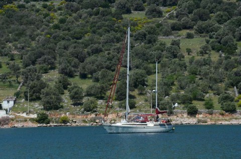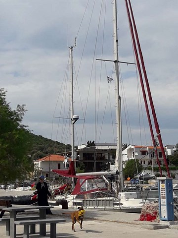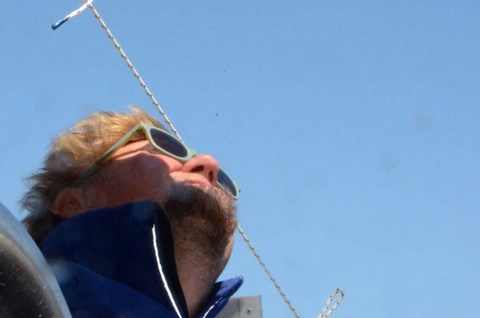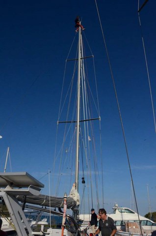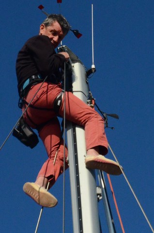 Il est bien grand le mat du Sherpa! Pascal peut vous en parler, lui qui est monté en tête de mat pour rebrancher la girouette anémomètre ! Nota : Le vent était ENFIN tombé.