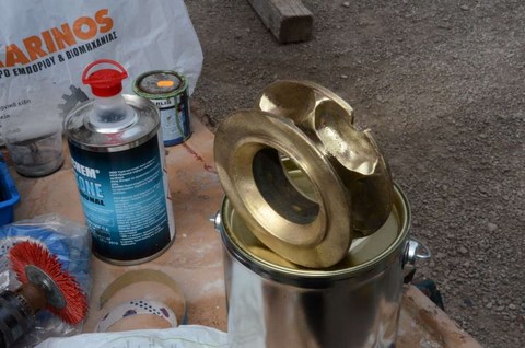 Après, il a fallu faire la vidange du moteur, vérifier les vannes, démarrer le moulin...ce qui nous a permis de constater l'usure de notre joint tournant ( à changer l'an prochain) et la casse de notre filtre à eau Vetus, qui nous a permis, grâce à l'intervention de notre copain Lionel, d'aller jusqu'au port, mais qui sera changé la semaine prochaine, par précaution. Entre temps, on a eu de gros orages qui nous ont empêchés d'aller au bout de nos ouvrages...