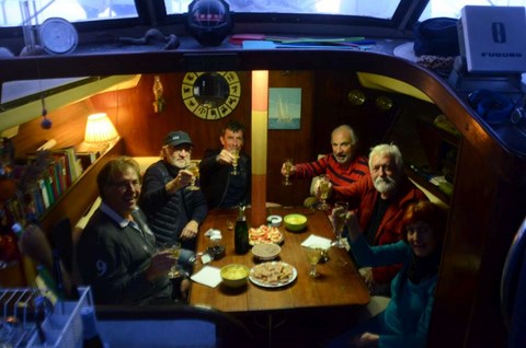 Ensuite on a eu droit à un gros coup de vent, pendant près de deux jours, qui nous a interdit de faire des travaux à l'extérieur. Du coup, on en a profité pour inviter la grosse bande joyeuse du "batôdacoté", un MAGNIFIQUE ( j'y reviendrais) dériveur intégral, un des derniers plans, tout alu, du regretté architecte naval CAROFF.