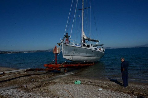 Je vous laisse retourner à l'acceuil sur cette photo de Javotte quittant son bord dans le port de Chalkoutsi.