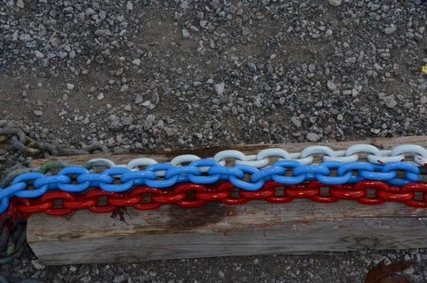 Et puis au marquage de notre belle chaine quasi neuve, cadeau de nos chers amis italiens Civita et Mauro, tellement gentils, tellement généreux! (mille bises à vous deux!) qui va remplacer notre tas de rouille (qui n'avait que trois saisons, mais dont la galvanisation n'a pas du tout tenu ses promesses) :