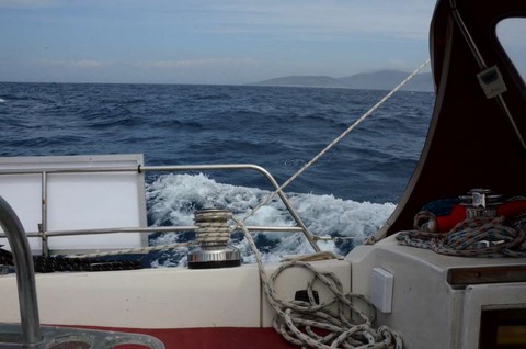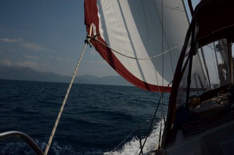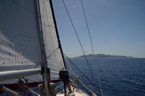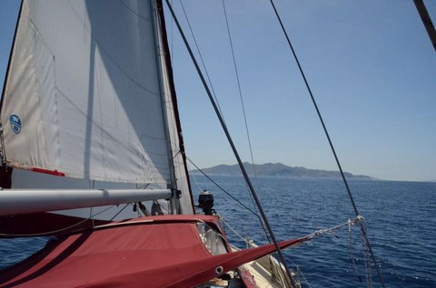 Depuis 8 heures ce matin, Samedi 29, nous sommes en route pour Ikaria, où nous ne sommes jamais allé, toutes voiles dehors au près bon plein, sur mer absolument plate, aux alentours de 6 noeuds, tranquilles comme Baptiste. Le peid intégral.