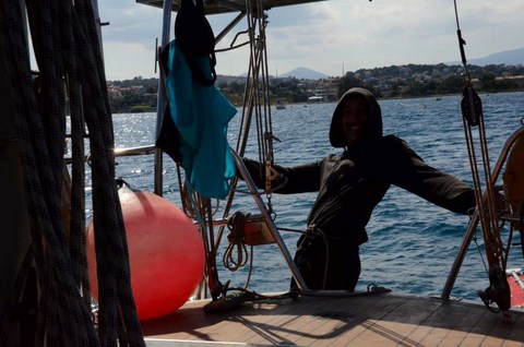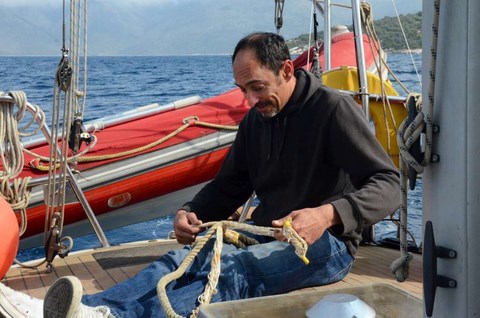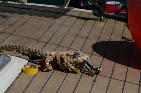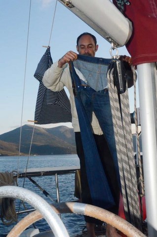 Donc, il fait grand beau pour la nav' entre Almyropotamos et Porto Rafti. Et l'appétit et e moral sont au beau fixe! Pendant la nav', Thierry est venu à bout de son épissure et vous constaterez, à la dernière photo du carrousel ci-dessous, qu'elle est tout bonement MAGNIFIQUE