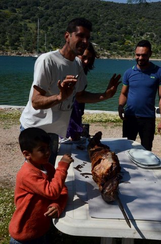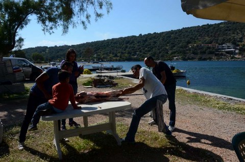 La réponse ne tarde pas : "Non, c'est Pâques ! Mais, si vous voulez de l'agneau pascal, revenez dans deux heures, vous êts nos invités ! Bienvenue à Porto Voufalo, mes amis!"