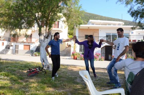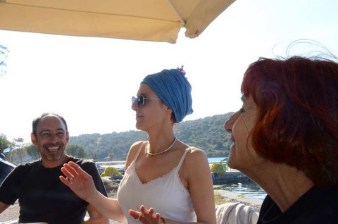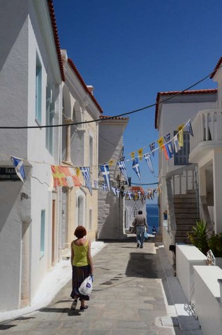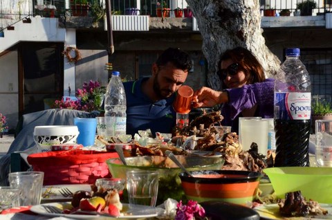 Il y a des familles grecques qui mangent dehors et qui nous saluent avec force "Kaliméra, Kalos ilthatet" (bonjour bienvenue) auxquels je réponds par des "yassas, Kali orexi!" (salut, bon appétit!)