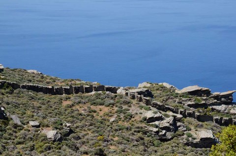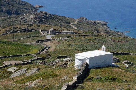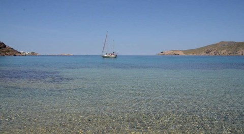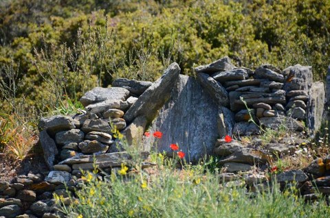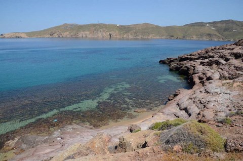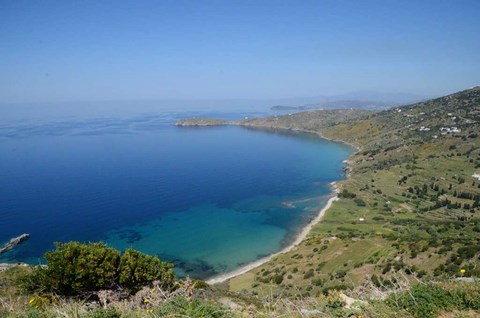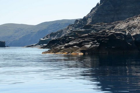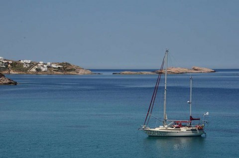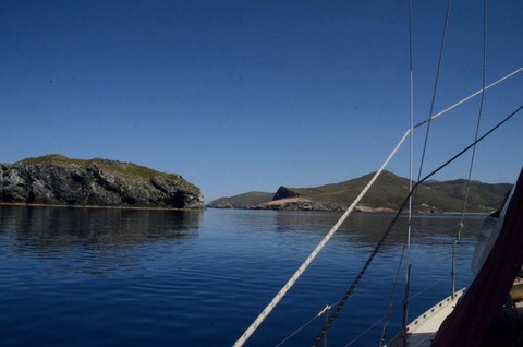 Jeudi matin, on a rendu l'auto et on est partis sur Tinos, découvrir un mouillage jamais pratiqué par nous auparavant. Il faut dire qu'il est ouvert au Nord et qu'on profite lâchement du petit sud pour in vestir ce bel endroit. La nav' se fait sur une mer d'huile, tout au moteur, faute d'un moindre souffle de vent. Mais le mouillage fut une belle récompense: