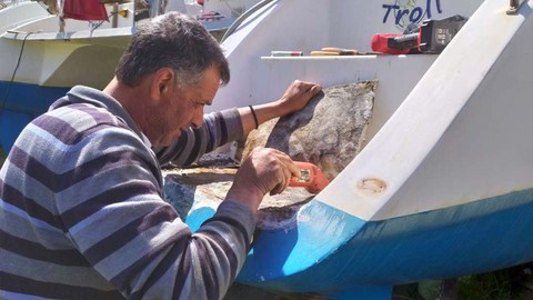 On y est allés, séance tenante, avec Luigi qui avait aussi besoin de bois, et, dans cette menuiserie effectivement et discrètement ouverte, nous avons trouvé notre bonheur . Pour lui, du contreplaqué marine, Pour moi, fabrication spéciale d'une baguette/cornière en Iroko ! Sur le champ et pour 5€!!! C'est la Grèce!