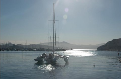 Claude. C'est Claude, qui nous avait bien aidés, au port du frioul, à nettoyer notre Tohatsu qui était passé sous l'eau dans l'anse de Pommègues. A l'époque, il se baladait en trimaran :