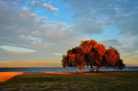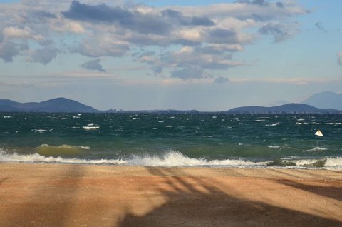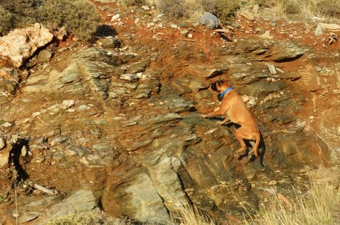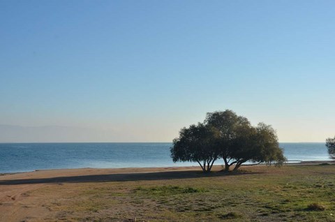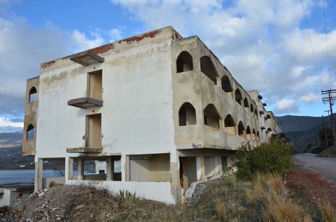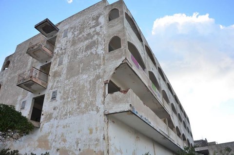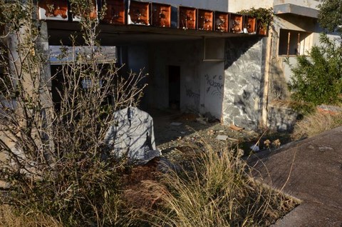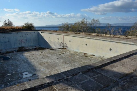 Le 24, le Père Noël, un peu en avance, nous a apporté le soleil. Du coup, on est allé se promener, hélas, sans Inou qui ne voulait visiblement pas venir avec nous. Nous avons pris les autos et sommes allés à deux ou trois kilomètres, vers le cap, "gardé" par un hotel abandonné, sans doute de l'époque des colonels, avec son immense piscine délabrée: