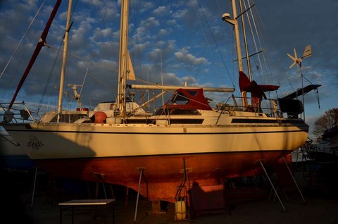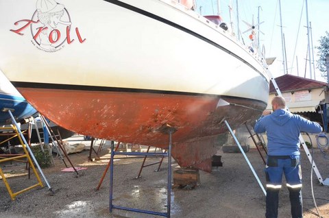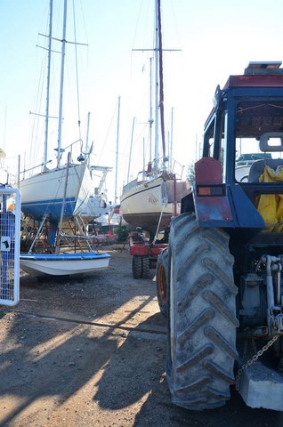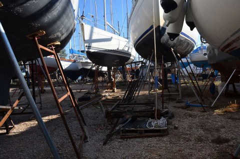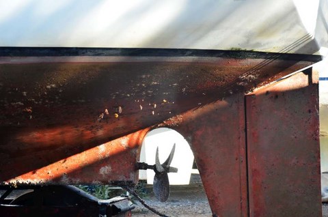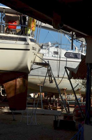 Il n 'est pas trop sale, cette année, le Troll, exceptés ces damnés coquillages qui sont décidémet bien tenaces. Du reste, là où il y en a le plus, c'est sur l'hélice, véritablement atteinte d'un exéma purulent alors que le reste de la coque n'est pas si atteinte, preuve que le Velox semble mal vieillir en pot. Vous noterez également la véritable forêt de bateaux à terre: