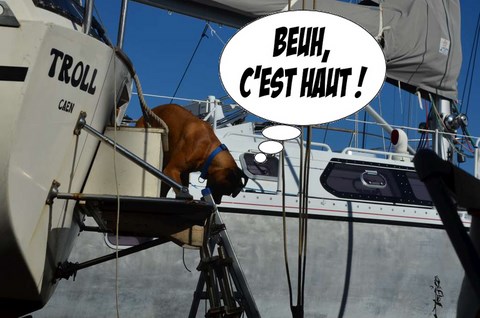 Cette année, pas de caravane pour les Trolliens. C'est aussi pour ça qu'ils sont contents ! Parce que, cette année, pas de grands déménagements depuis le bateau, confortable, douillet, vers la caravane, humide, au matelas pourri, à l'étanchéité douteuse. On s'est mis d'accord il y a un mois avec Denis pour mettre le beateau le plus bas possible afin de pouvoir monter et descendre Javotte de façon relativement aisée, sans lui faire subir ce que nous avions tenté, l'an dernier : L'ascenseur