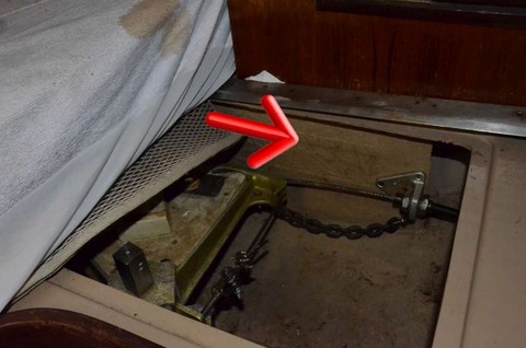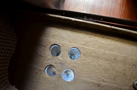 Le problème, c'est (c'était) que la fixation inférieure, en photo au-dessus, est totalement inaccessible de l'intérieur, car les écrous sont derrière une cloison, derrière le secteur de barre :