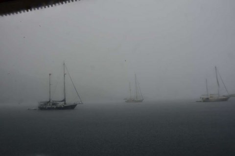 Et quand on est à deux doigts de prendre notre café sur les genoux, à cause d'une houle d'Est de plus en plus entêtée, je décide de lever l'ancre et d'aller nous réfugier un mille plus au fond de la baie. Et là, c'est le bonheur, parce que la houle n'y arrive pas.