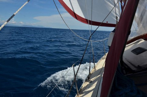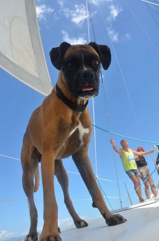 Alors, prédestiné, le surnom du bonnet rouge? Ben je sais pas, mais ce que je sais, c'est qu'on a tout fait à la voile et que, skipper débutant, Zeff s'en est sorti comme un grand. Au bon plein comme au travers par un bon 4à 5, très peu d'erreurs, un bon ressenti à la barre. Non, rien à dire, parfait ! Apparemment, ça lui a bien plu :