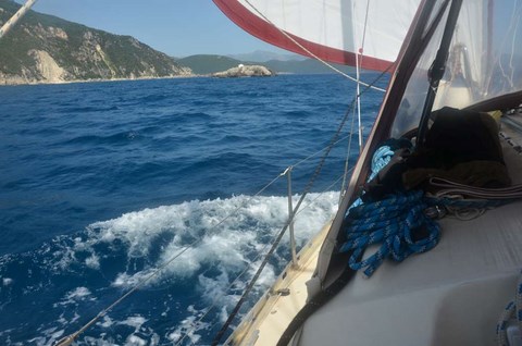 Nous voici donc en route pour Agios Stefanos, vanté par nos amis de DEBER. L'Albanie à Triibord, Corfou à bâbord, les conditions météo sont épouvantables et la mer particulièrement déchaînée :