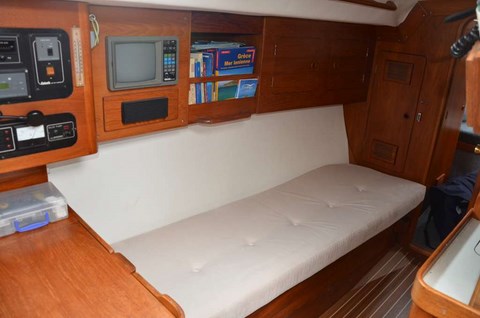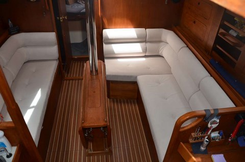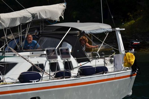 Ce sont Lucette et Jean-Pierre, adorables, qui naviguent sur un EVASION 37 PRESTIGE ( ça change tout ! Non, en fait rien, si ce n'est un peu de teck en plus, un peu d'ébénisterie supplémentaire et que c'est un des tout derniers 37 sortis de chez Beneteau!)