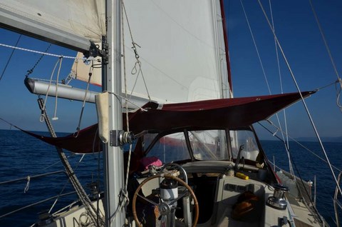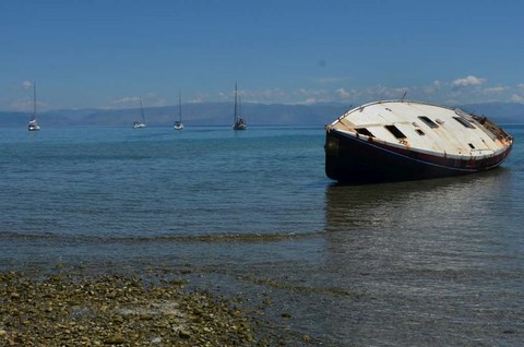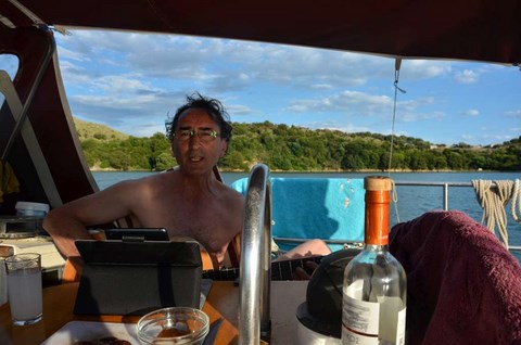 Bon, c'est pas aussi moche que je le décris, mais, au bout de bientôt 9 ans dans ces eaux, on est devenus très difficiles. On pioche quand même, là où on peut et on décide de se faire une petite taverna. Las, elles sont toutes super chers ! On change de projet et l'on fait des courses pour une salade express à bord, express car pas question de passer la nuit là !