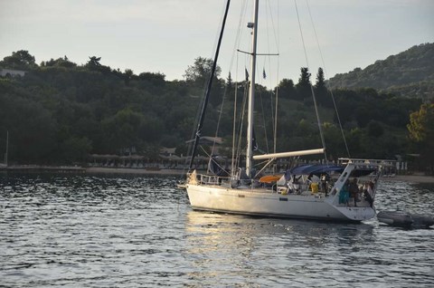 On s'apprêtait à passer la nuit ici. Bon, c'était un poil houleux, mais bon. On avait prévu d'aller manger au village le soir. C'était sansd compter un mail de Nicolas et Siri, qui vaient enfin remâté leur bateau et qui nous demandaient où on était, alors qu'ils étaient à sivota/Mourtos, 13 milles plus au nord. Comme c'était quand même houleux, qu'on avait super envie de les voir et que le vent paraissait tomber, hop, on a levé l'ancre. las, on va faire les 13 milles vent (15/20 noeuds) et vagues dans la gueule, Et, vu l'heure, pas quesrion de tirer des bords ! On est arrivés fourbus mais heureus en baie du monastère où nous étions tant fait secouer au début du mois dernier !
