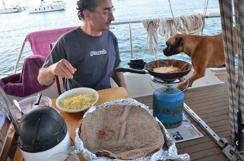 Le soir, on a retrouvé Mauro a qui nous avons pu remettre le guindeau si généreusement offert par nos amis Siri et Nicolas! Il était fin heureux le Mauro et, du coup, il nous a payé une pita. ( En fait, on est allés manger tous ensemble, et il s'est démerdé pour payer, le fourbe!)