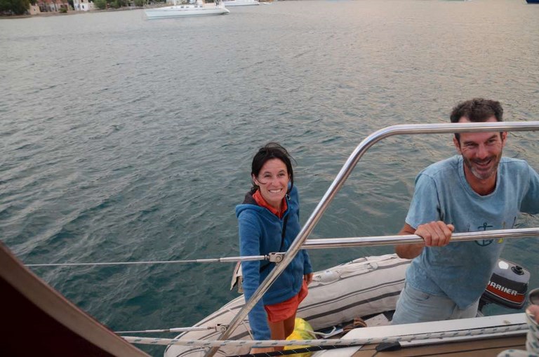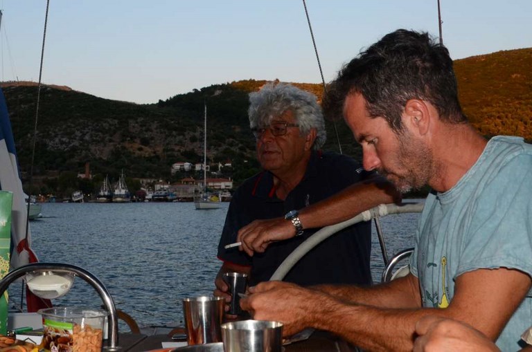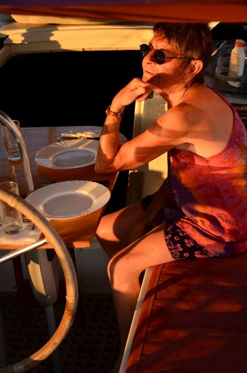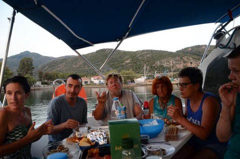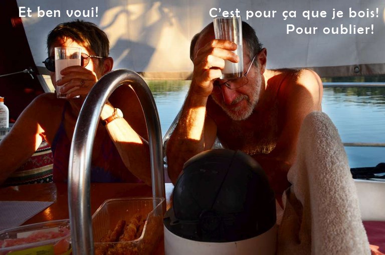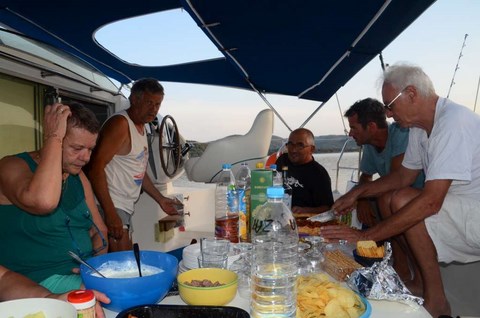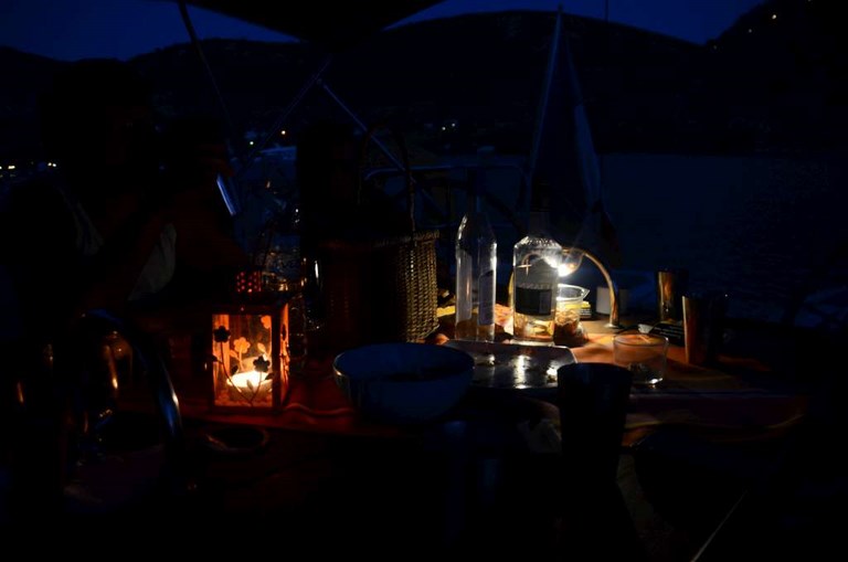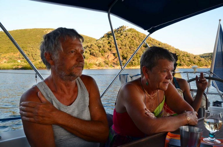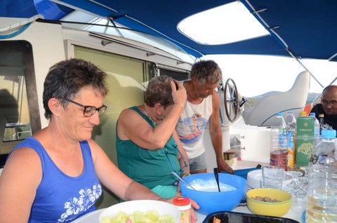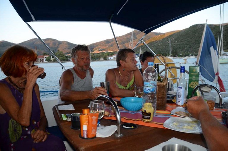 Et là, nous nous sommes tous retrouvés : Kairos, Deber, Fulmar et aussi Nicole et Pierre, sur Tawali, avec qui nous avons eu le plaisir de faire mieux connaissance. Ils sont super super tous les deux. Du coup, tout ce petit monde (!) s'est rapporché, et les rencontres se sont succédées à toute allure, à la taverna et sur les bateaux. Plutôt que de vous parler encore de tout ça, des apéros sur Troll, des repas sur Tawalli, sur Deber, , le mieux, c'est encore quelques illustrations: