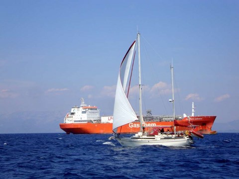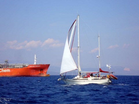 Puis nous filons, dans un vent arrière de 15 à 20 noeuds, rejoindre Fulmar qui croise devant le port de Chios. Nous profitons de ce flux de Sud pour monter ensemble à Langadha, au nord de l'île.