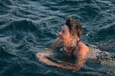 D'abord, avant même le premier ouzo, qui sera suivi par beaucoup d'autres, on a commencé par se baigner, parce que la canicule est arrivée en Grèce (sauf ma pauvre Françoise, encore privée de baignade, sa blessure tardant à se cicatriser en totalité!) :