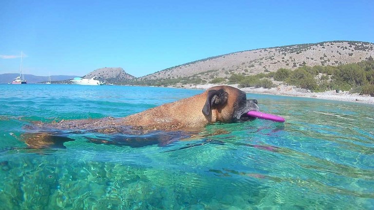 Or donc, la voilà au mouillage, la petite famille recomposée: le Patoche, la Grobigoutitine et la petite Shiva ! Comme ils sont contents d'être en Grèce et à l'eau