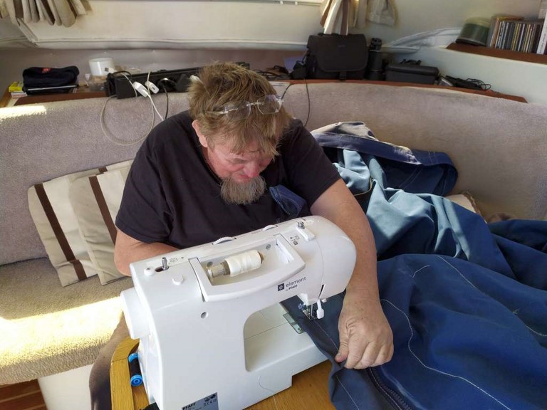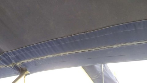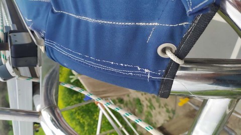 Avec ma machine à coudre toute neuve, j'ai restauré TOUT SEUL le taud de soleil ! Dire que je suis fier de l'oeuvre accomplie un est doux euphémisme ! Pensée pour mon copain Roland Woener, grand couturier devant l'éternel )