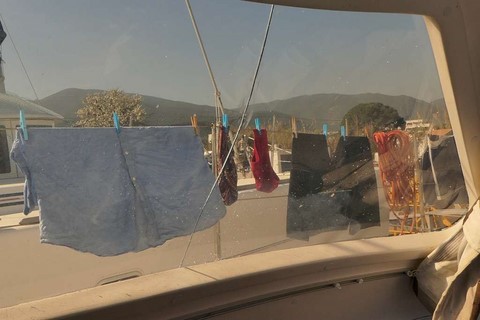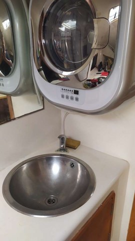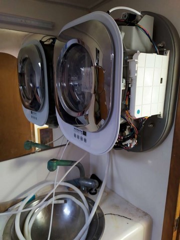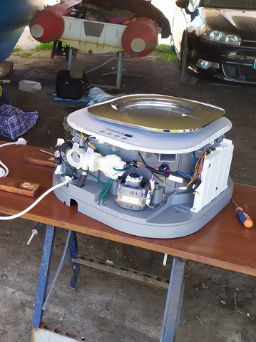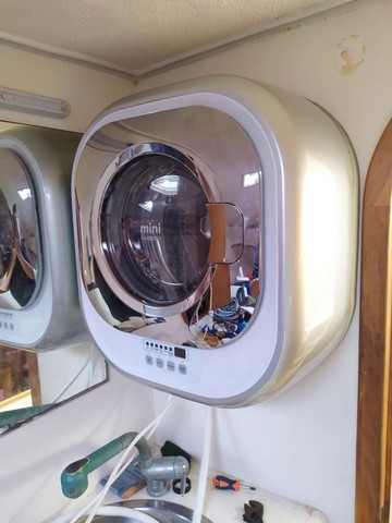 Maintenant qu'on a un grand bateau, bientôt 600w de panneaux solaires, il est temps qu"on puisse se passer d'aller en laverie ! En plus, en ce moment, on va pas aller stationner dans un lieu humide où l'on fréquenterait des pauvres qui n'ont pas les moyens de se payer une Machine à laver, hein ! On n'est pas cons, non plus !