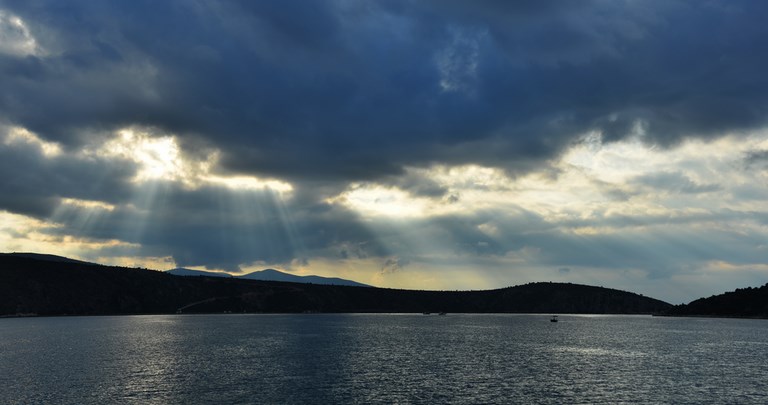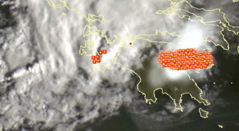 Du coup, là je regarde ! Oh Putain ! . Ce que j'y vois explique tout : Une vague gigantesque d'impact de foudre et de vent déferle sur nous et va sur Ermioni et Poros à tout allure: