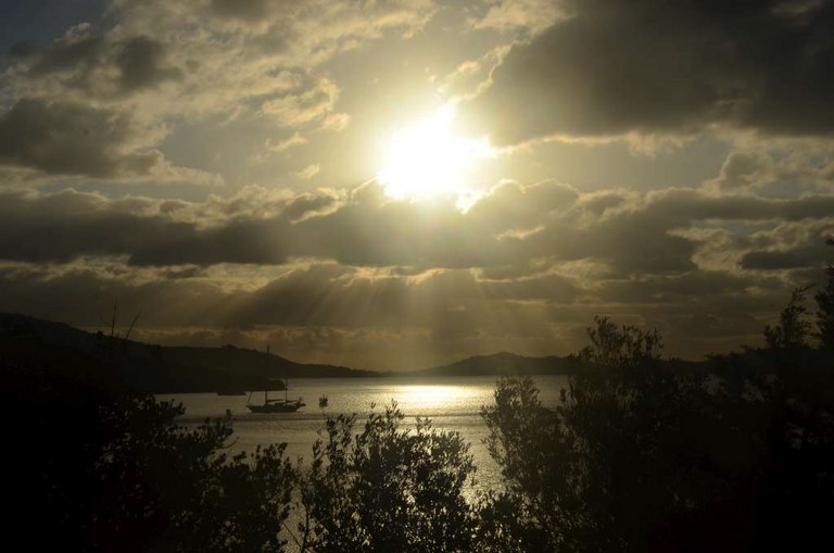 Le dimanche, on passe dire au-revoir au DEFER, qui ont bien abimé leur jupe à Nafplio ( ça a castagné pas mal là-bas aussi. TOUS les bateaux au quai ont tapé!) et on part pour ERMIONI. Mi voile mi moteur, la nav' est sympa. Pas grand monde à Kiladha, juste un beau coucher de soleil: