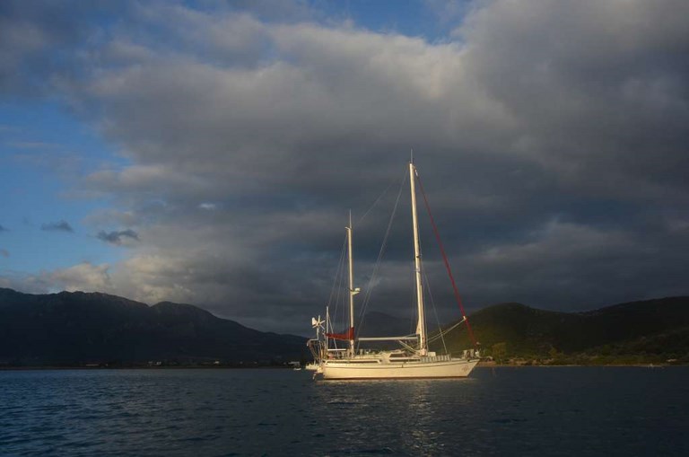 Au matin, NEFER vient nous faire coucou juste avant notre appareillage pour Vivari où nous avions hiverné sur la bouées de généreux amis l'hiver 2013. Comme ils vont aussi à Vivari bientôt, on se retrouvera là-bas.