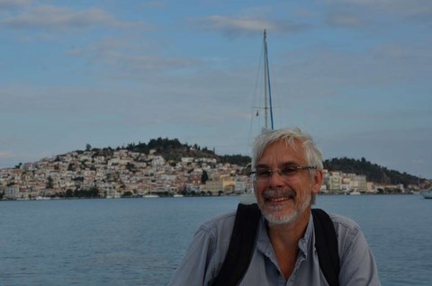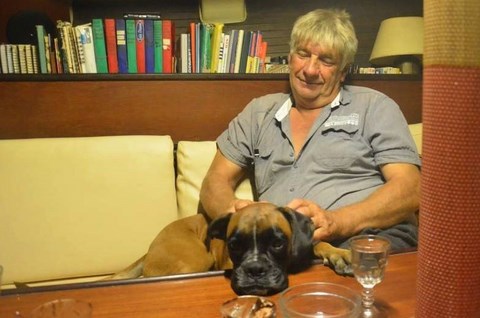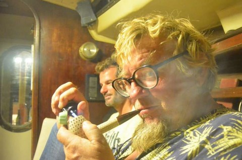 Surprise, nous retrouvons, dans son annexe, notre..."voisin de ber" du chantier de Chalkoutsi: Le délicieux Michael, terriblement ( et joyeusement) britannique, jusqu'au bout de l'humour.