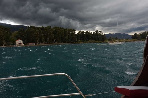 C'est dantestque tellement le vent est violent! Heureusement, il n'y pas de vague car la baie est petite. Mais c'est aussi ce qui va donner au vent la possibilité de s'accélerer encore.