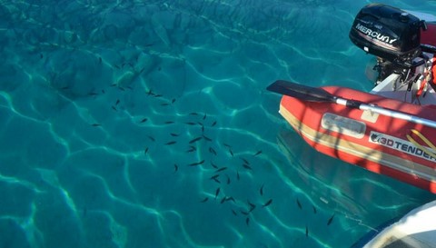 Du 27 septembre au 9 octobre, on a mouillé, avec bonheur, devant "notre" petit bois d'eucalyptus. Temps splendide, que du bonheur, et puis, ça s'est un poil gaté ! PArce que, là-bas, on s'est pris un genre de rincée que réserve parfois la Grèce ! Une bassine d'eau renversée direct sur la tronche. j'ai récupéré plus de 200 litres de flotte dans l'annexe en moins d'une demi journée !