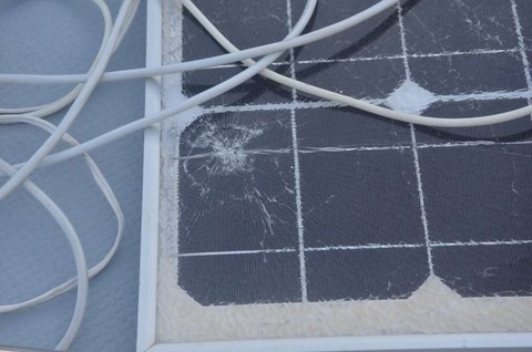Tiens? Notre panneau solaire "volant" a volé (et s'est retourné sur les bloqueurs!) . Il est mort ! ça tombre bien, on compte tout changer!
