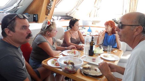 A Dokhos, on fait ENFIN connaissance pour de vrai, avec Patrick et Martine, sur GROCATA, un naviplane 11mètres, entièrement construit par Patrick, à partir des coques et du pont nus.