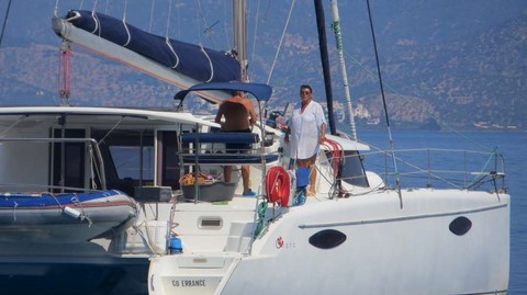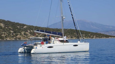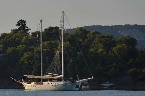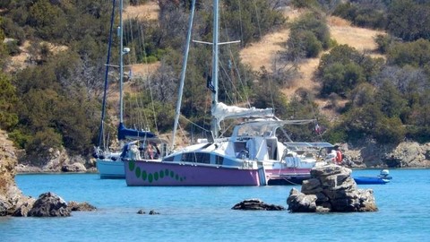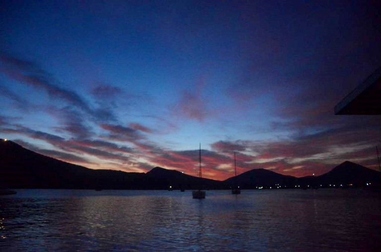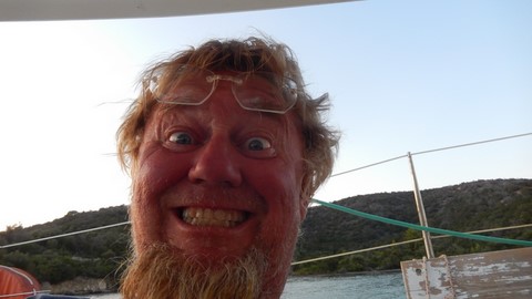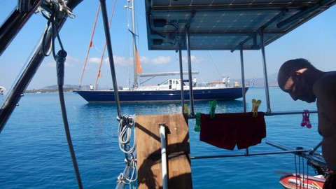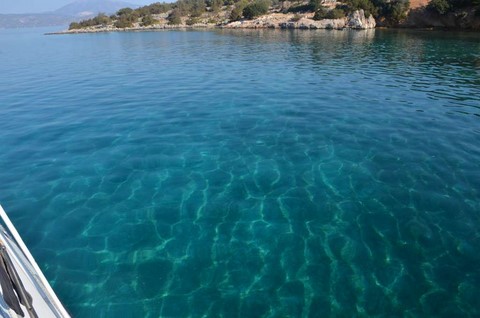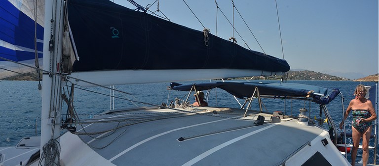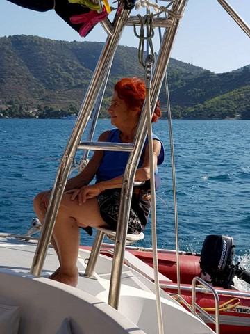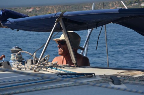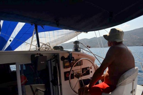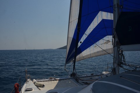 Le lendemain, c'est à dire, le 3 Septembre ( Faut vraiment tout vous mâcher, hein !) on a hissé toutes les voiles ( mis en marche les deux moteurs) et traversé l'immensité ( la baie) pour aller à Ormos Vidhi ( d'où on était partis avant hier) , pour attendre la bise ( le ventounet) qui nous emmenera demain ( ou après demain) à Dokhos ( où nous étions la semaine dernière).