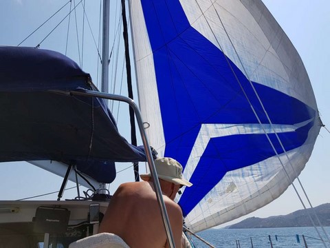 Le lendemain, 4 septembre, pour ceux qui ne suivent pas, nous voici, en route pour la belle dokhos. On a mis le gennak' et hop: Avant, on a quand même, auparavant, petit déjeûné: