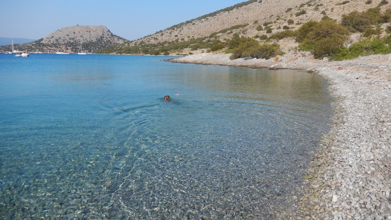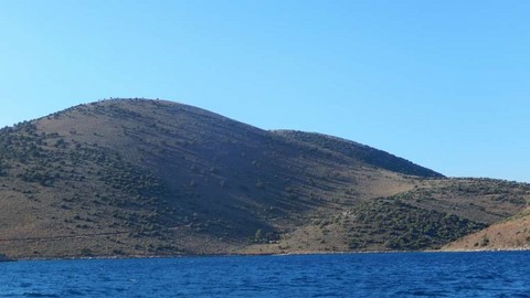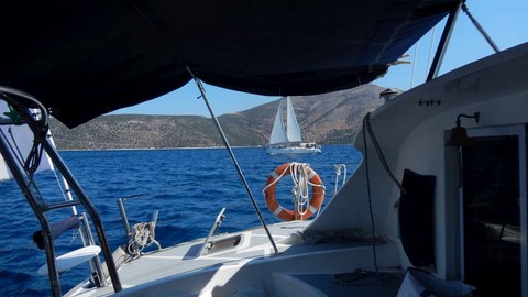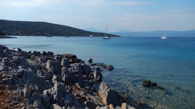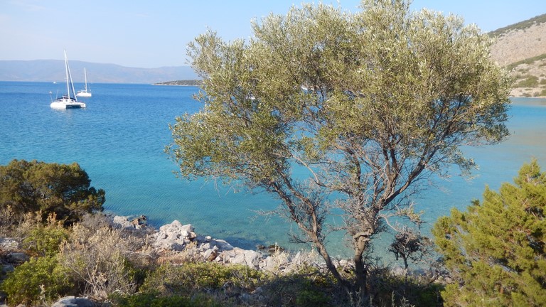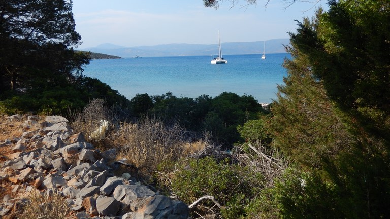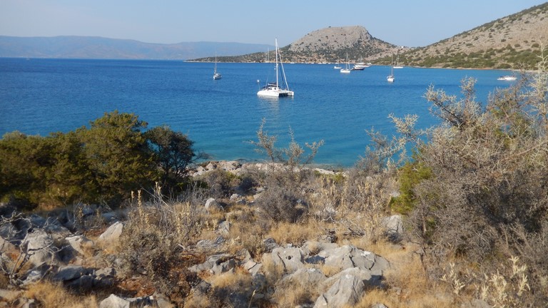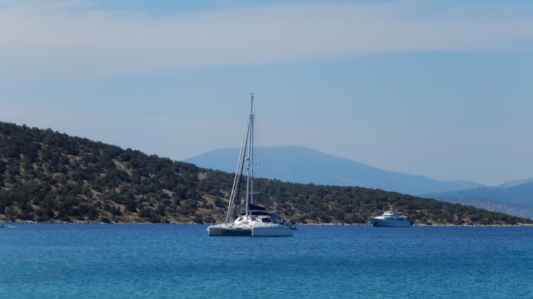 On arrive tranquilles au chantier, après une nav' sans histoire....et sans vent. De toute façon, dans ce goulet entre continent et Evoia, c'est soit rien, soit du 7 ( et j'éxagère à peine ! Il parait que les grecs appellent l'endroit " le trou de merde" !)