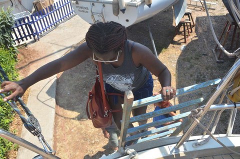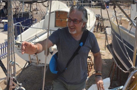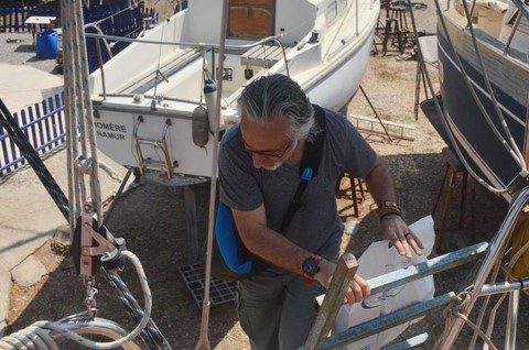 le lendemain, on grée les voiles, on les dégrée, sous un soleil de plomb. Aucune photo, car j'étais bien trop concentré à bien expliquer et à ne rien oublier pour en prendre. Xavier et Jackie filment tout ce qu'on se dit, histoire que la mémoire ne leur joue pas des tours quand viendra le temps de la mise à l'eau...dans un an . Oui, car, là, ils ne sont venu que trois jours. Leurs premières navigations auront lieu au mois de ...Juin prochain, leurs projets respectifs ( ils bossent en ONG au Bengladesh) les empêchant de partir avant cette échéance. Pire, ils n'auront que trois semaines pour se faire la main, avant le vrai retoue sur LOST en fin d'année, cette fois-ci, pour au moins deux années sabbatiques.