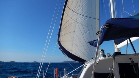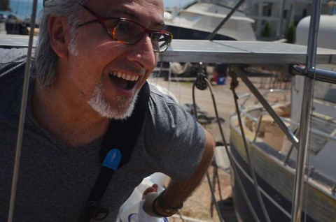 Ah si, le mien, quand, le dernier jour, Xavier veut monter au mat sous un soleil écrasant, histoire de jeter un coup d'oeil au gréément ! C'est bien légitimen, mais, avec la fatigue accumulée, j'ai quelques craintes. Heureusement la manivelle électrique de winch bosse à ma place et, bientôt, le gréément est validé.