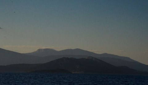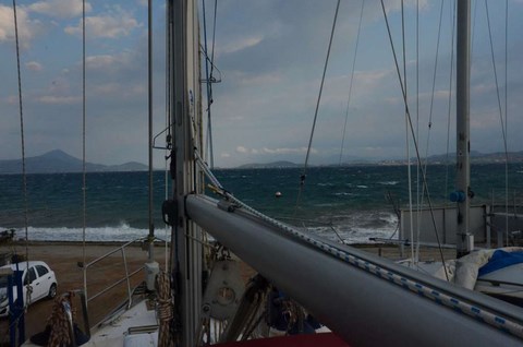 Bien secoués nous fûmes dès qu'Evia ne nous protégeait plus du vent du Nord (25 noeuds constants. maniable) . Comme d'habitude, les photos prises sont totalement impuissantes à rendre compte du shaker ! Il faut dire aussi qu'aux pires moments, on s'aggripe, on ne prend pas de photos!