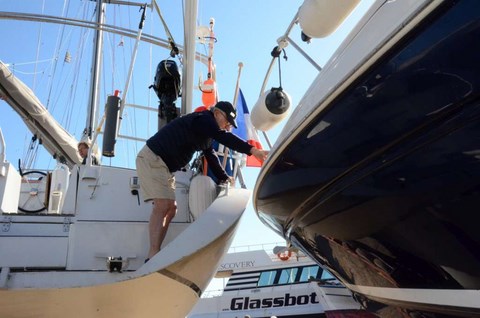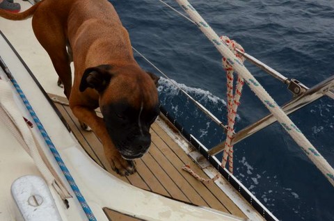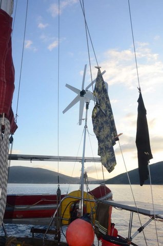 Il est bien grand le mat du Sherpa! Pascal peut vous en parler, lui qui est monté en tête de mat pour rebrancher la girouette anémomètre ! Nota : Le vent était ENFIN tombé.