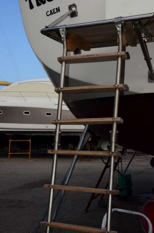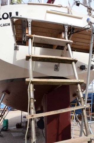Après la plateforme ( merci encore Robert!), nous nous sommes attaqués ( Françoise l'inox, moi le bois et la visserie) à l'échelle de bain, qui avait bien besoin d'un ptit refit: