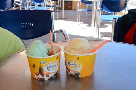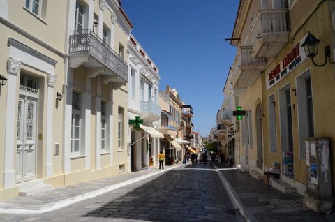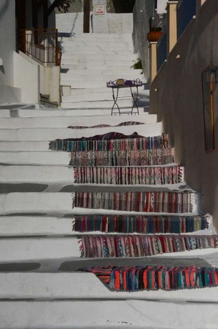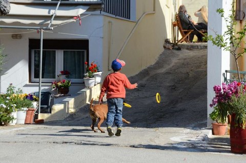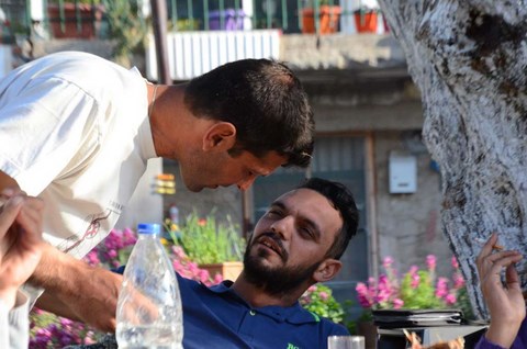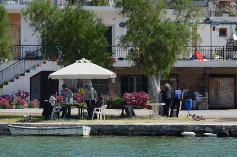 Il y a des familles grecques qui mangent dehors et qui nous saluent avec force "Kaliméra, Kalos ilthatet" (bonjour bienvenue) auxquels je réponds par des "yassas, Kali orexi!" (salut, bon appétit!)