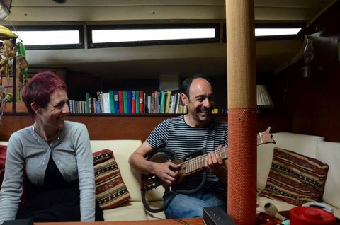 Ensuite on a eu droit à un gros coup de vent, pendant près de deux jours, qui nous a interdit de faire des travaux à l'extérieur. Du coup, on en a profité pour inviter la grosse bande joyeuse du "batôdacoté", un MAGNIFIQUE ( j'y reviendrais) dériveur intégral, un des derniers plans, tout alu, du regretté architecte naval CAROFF.